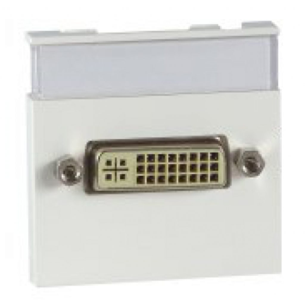 DVI-I (Dual-Link) Anschluss mit 200 mm Kabelpeitsche, Buchse/Buchse, gerader Abgang, mit eingelassenem Beschriftungsfeld, inkl. transparenter und flächenbündiger Abdeckung, Click 45, einrastbar horizontal, 2-modulig, 45×45 mm, Farbe weiß glänzend ähnlich