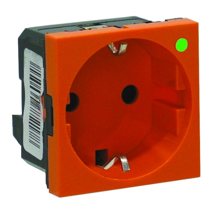 Steckdose 1-fach, 0° gerade, deutscher Standard, Click 45, 2-polig mit Schutzkontakt, 16 A, 230 V~, erhöhter Berührungsschutz, Steckklemmen, mit LED-Funktionsanzeige (grün) einrastbar horizontal, 2-modulig, 45×45 mm, Farbe orange glänzend ähnlich RAL 2003